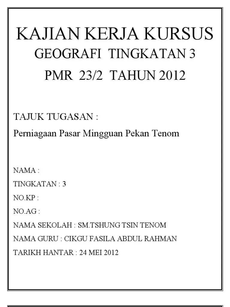 Kerja kursus goe sesi 2015. Berdasarkan pengumuman oleh lembaga peperiksaan malaysia, calon pt3 tahun ini telah ditugaskan untuk menajalani tugasan ujian pelbagai . Panduan tugasan lapangan bagi tajuk kajian taburan guna tanah & peta lakar. Contoh jawapan tugasan kerja kursus geografi pt3 2018 akan dikongsikan dari masa kesemasa. Contoh folio tugasan pt3 geografi lengkap dan panduan lukis graf bar.